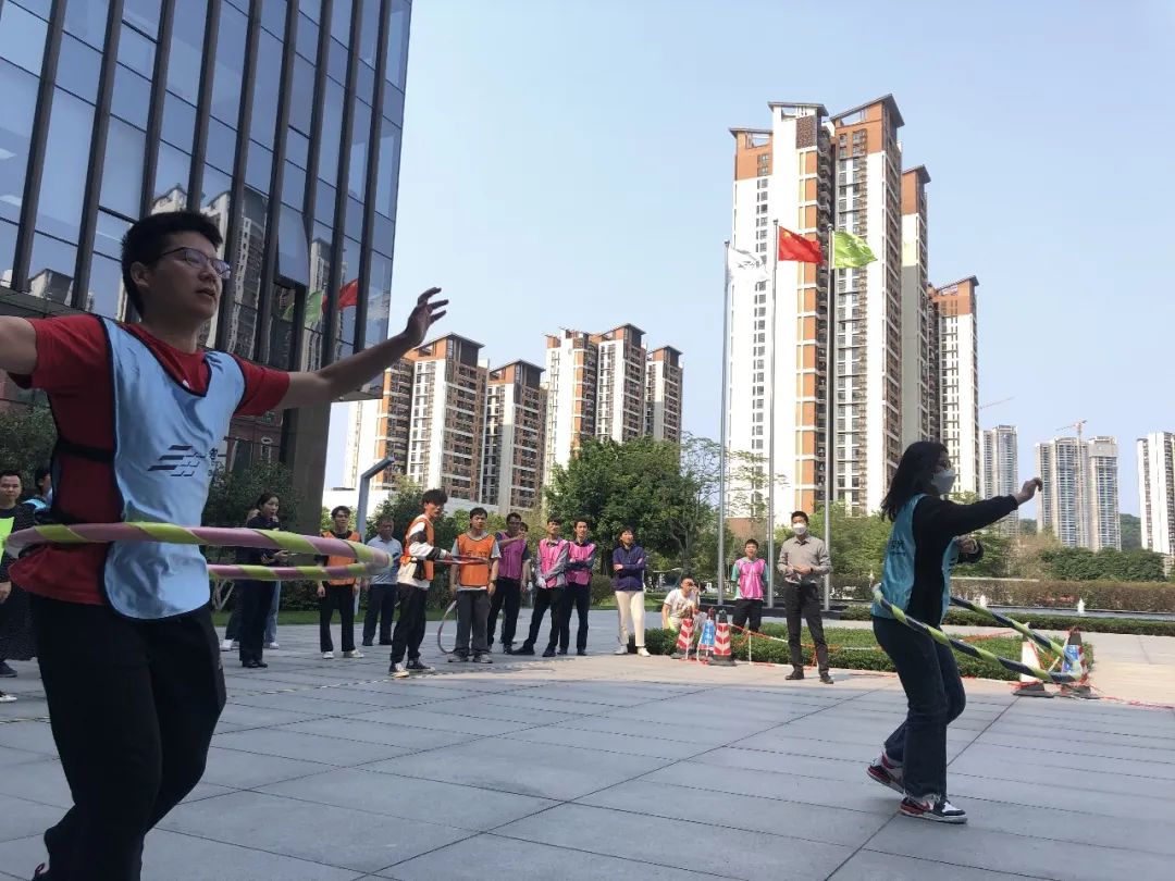趣味運動會的最后一個游戲環(huán)節(jié),每組派出4名選手,轉(zhuǎn)動呼啦圈進行接力往返,在呼啦圈不落地的情況下,用時短組獲勝。