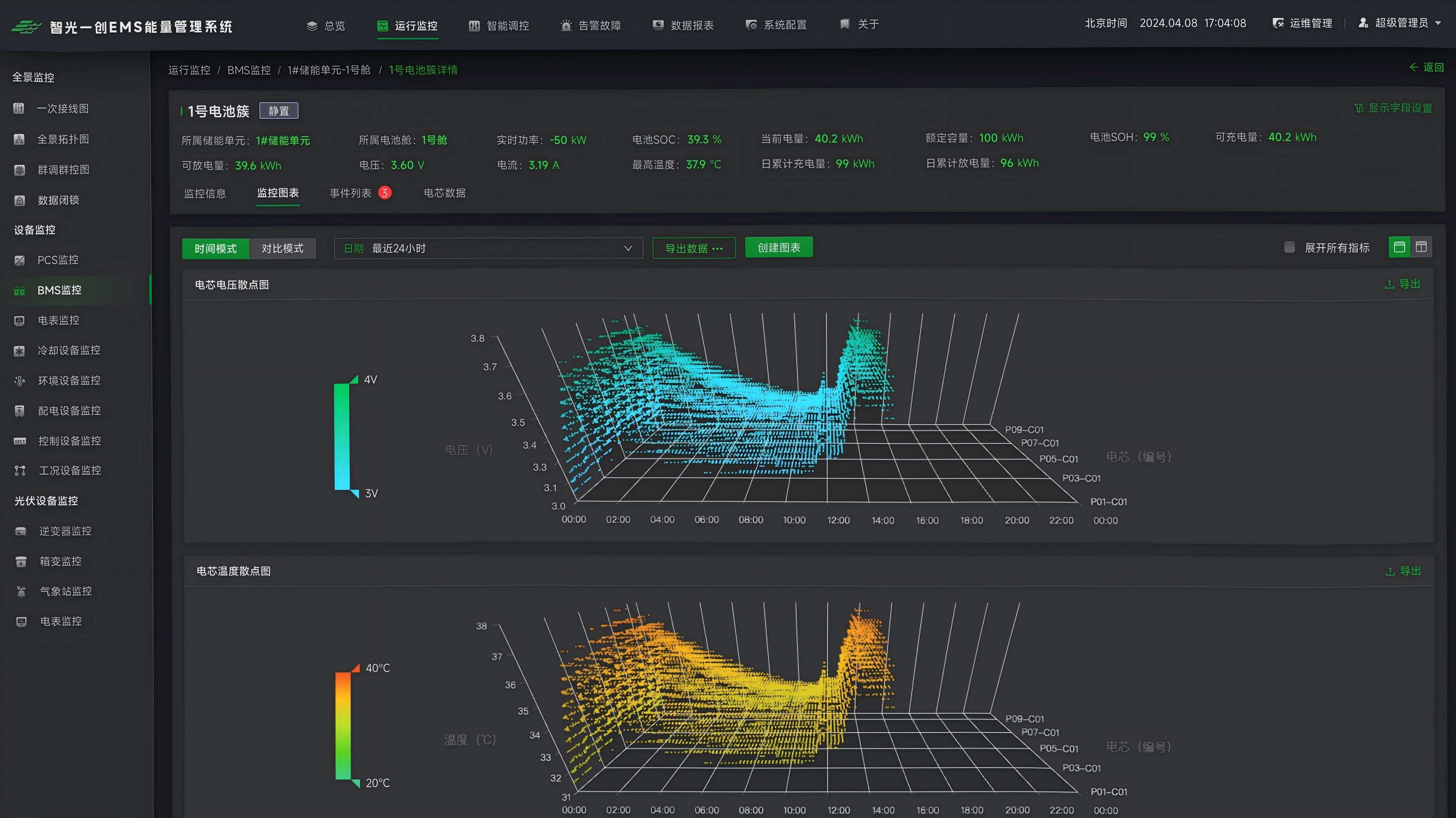 Data Monitoring & Visualization: Provides full-stack monitoring of ESS components, PV inverters, weather stations, cooling devices, and more. It supports customized single-line diagram drawing and real-time visualization of key data such as PCS, BMS, and electric meters.