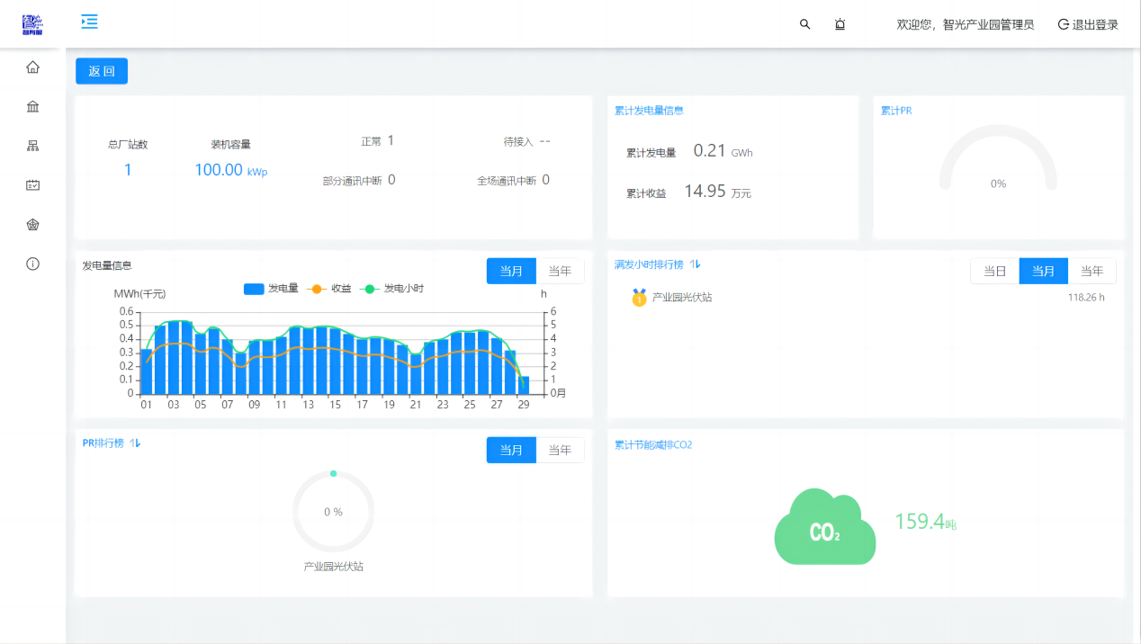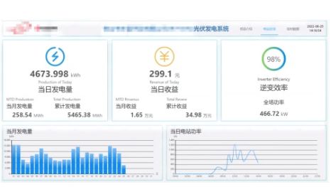 綜合數(shù)據(jù)大屏包括“項目介紹”、“電站總況”、“實時數(shù)據(jù)”三個輪播頁面。卡片形式呈現(xiàn)當日/當月/累計總發(fā)電量、當日/當月/累計收益、逆變效率、當月每日發(fā)電量柱狀圖、當日電站功率曲線圖,并實時展示當月二氧化碳減排量、當前環(huán)境溫度、當前輻照強度、當前風(fēng)速、累計二氧化碳減排量等節(jié)能指標。