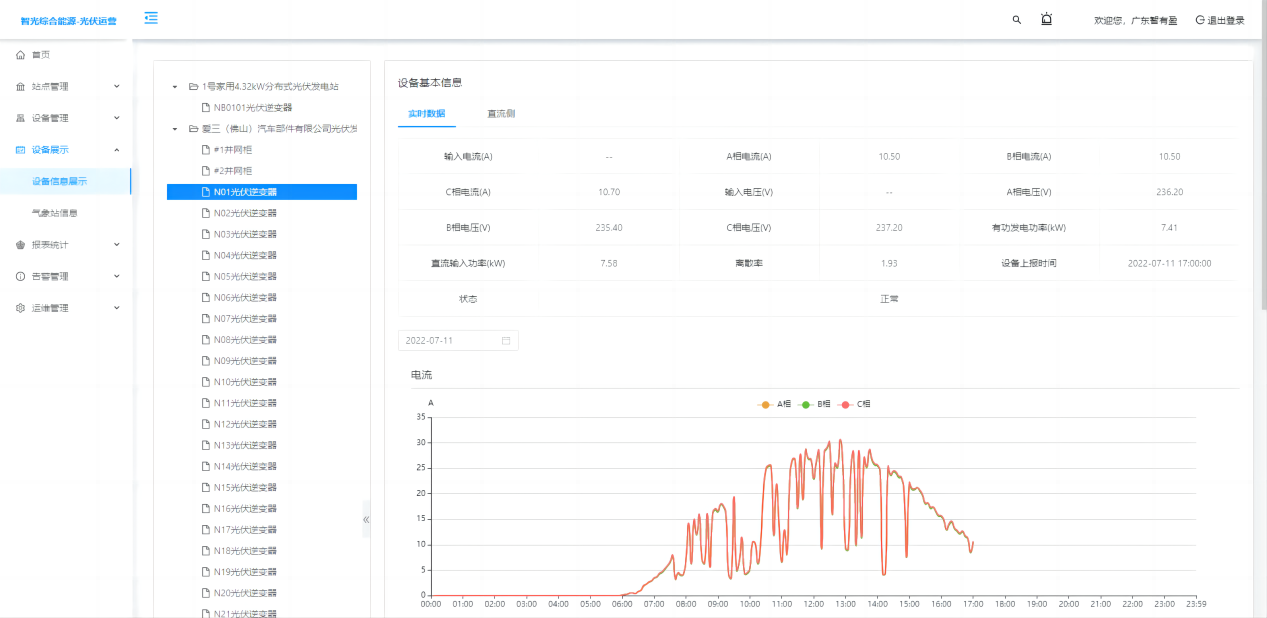 展示電站對應(yīng)的設(shè)備信息實時數(shù)據(jù),逆變器交流電流、電壓、功率的統(tǒng)計匯總曲線,直流側(cè)電壓電流監(jiān)測,以及氣象站風(fēng)速、溫濕度、輻射、壓力的數(shù)據(jù)曲線。