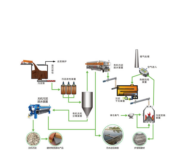 污泥通過分離+脫水+干化+焚燒,焚燒產(chǎn)生的能量可覆蓋干化段的所需能量。